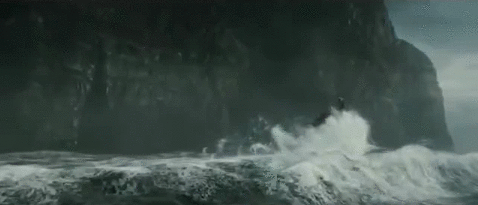 "Uma estranha luz encontrou os olhos deles: Eles estavam no canto de um grande lago preto, tão vasto que Harry não podia enxergar o lado oposto, numa caverna tão alta que o teto também era impossível de se ver. Uma luz verde brilhava longe no que parecia ser o centro do lago; estava refletida na água parada abaixo.
