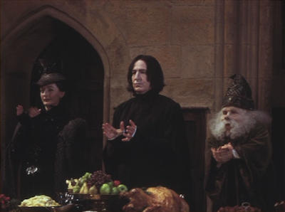 Talvez a cena mais engraçada do filme. Um grupo de alunos estuda no Salão Principal incluindo Harry, Rony e Hermione, onde conseguem uma pequena pista sobre a Pedra Filosofal.